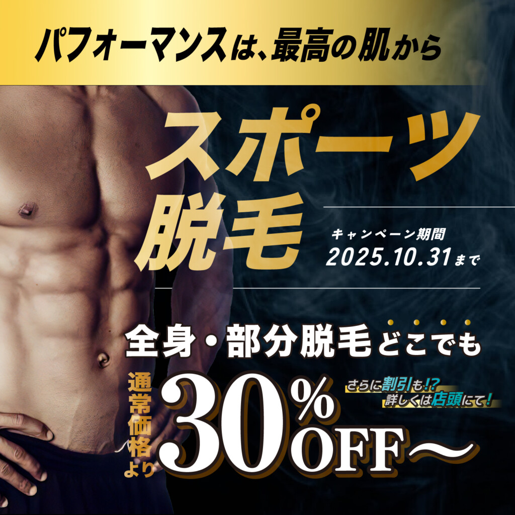 いつも当店をご利用いただきありがとうございます。2025年10月は、スポーツを楽しむ皆さまを応援する 「スポーツ脱毛キャンペーン」 を実施いたします!🏃快適に動ける、清潔感のある肌でこの秋を過ごしてみませんか?🍁
